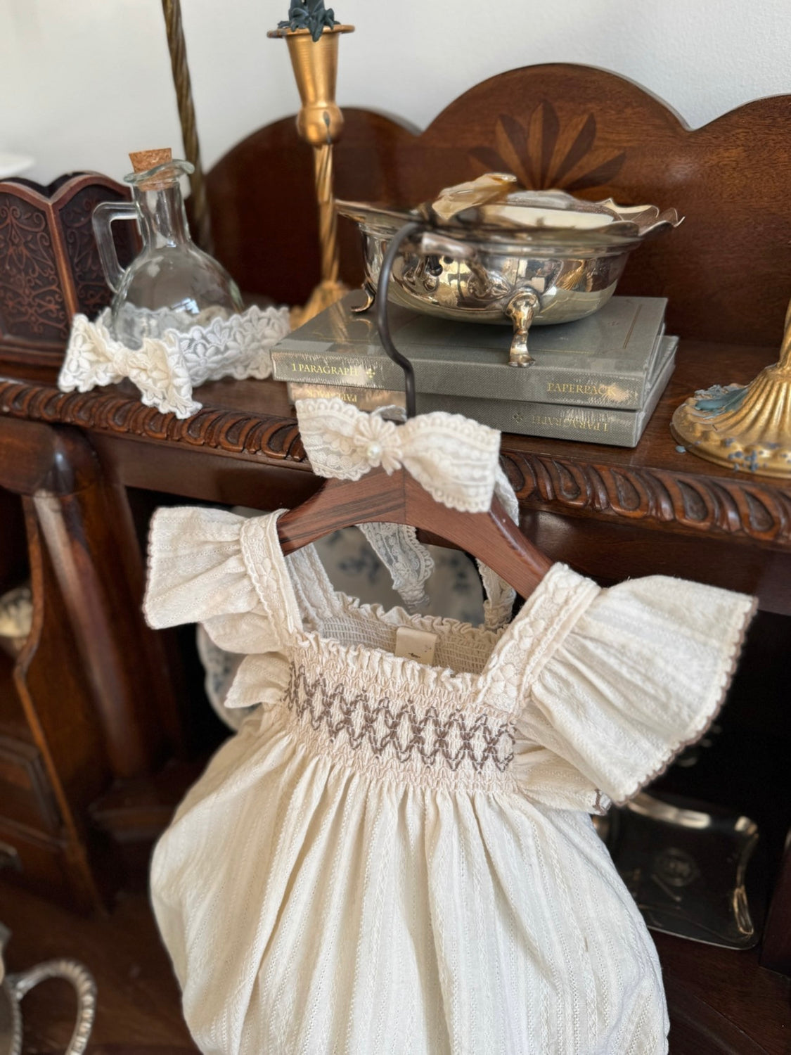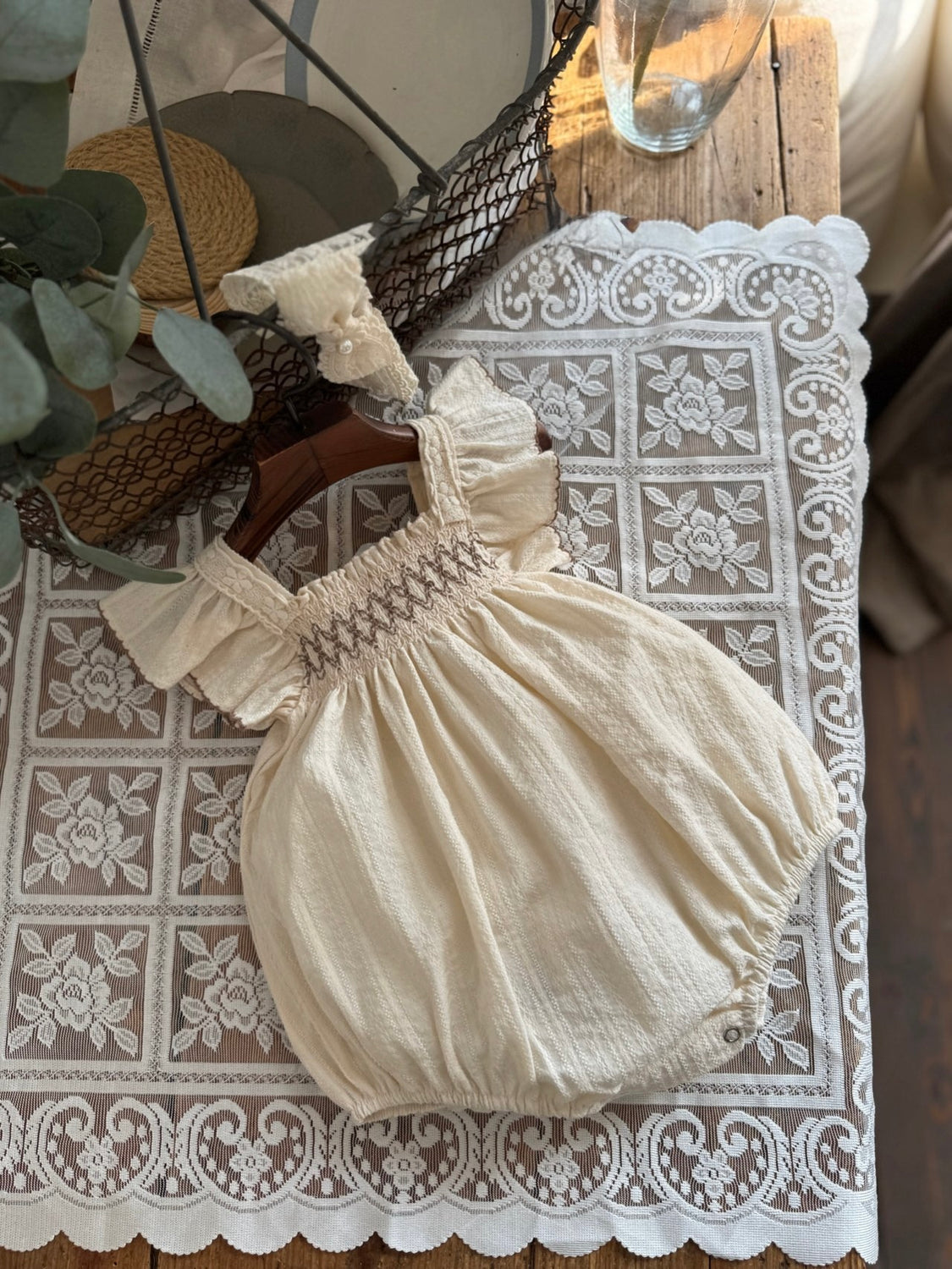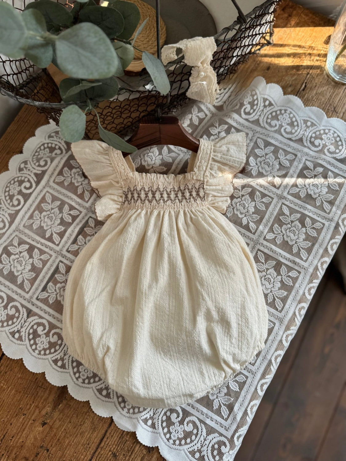 A soft, summery romper with smocking detail and flutter sleeves — perfect for everyday wear, photos and warm-weather outings.