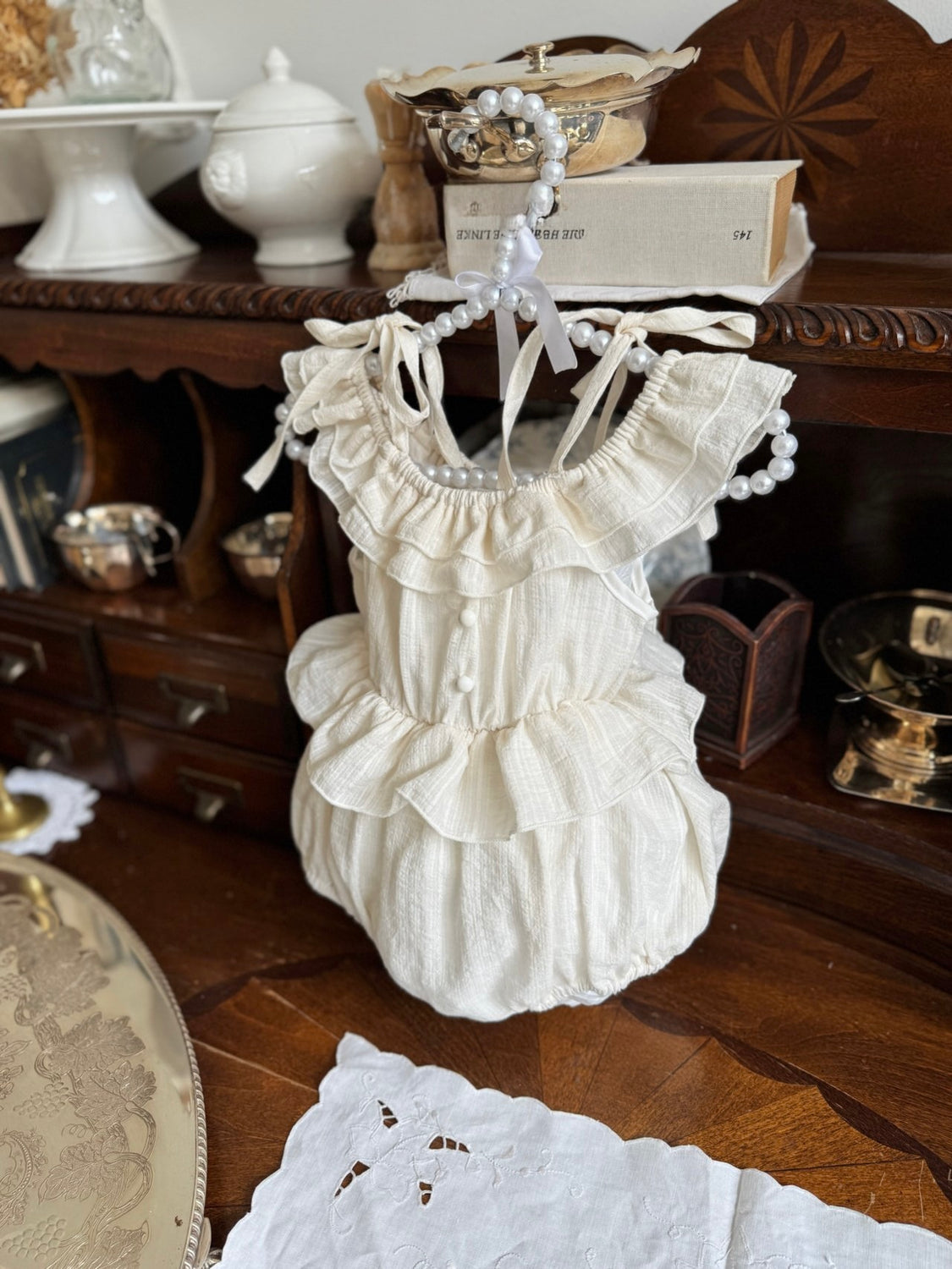 A sweet, vintage-inspired bodysuit with soft frills — perfect for outings, photos or layering under cardigans.